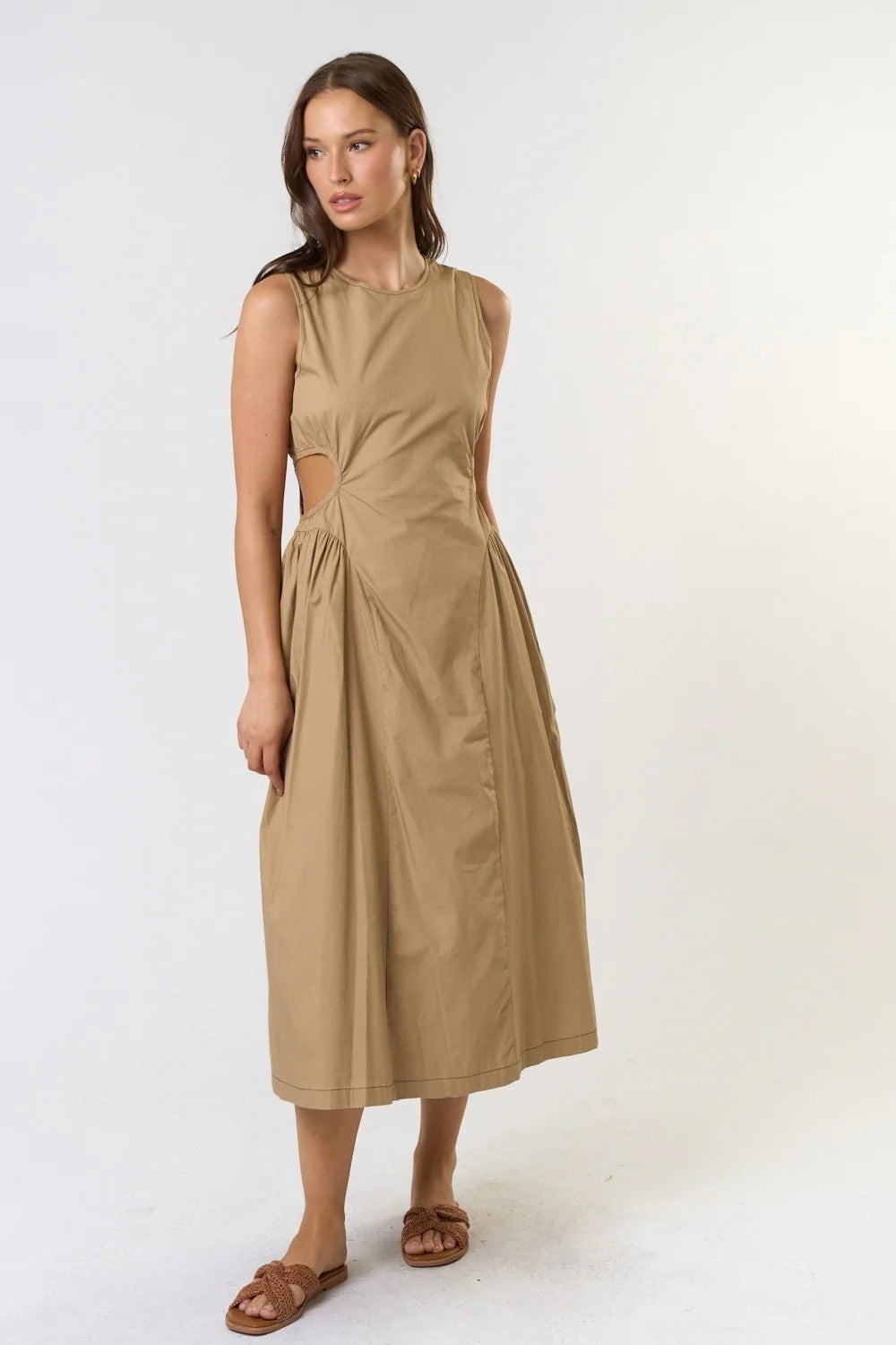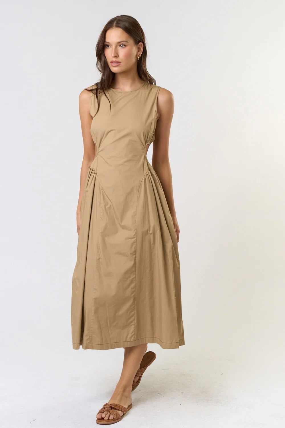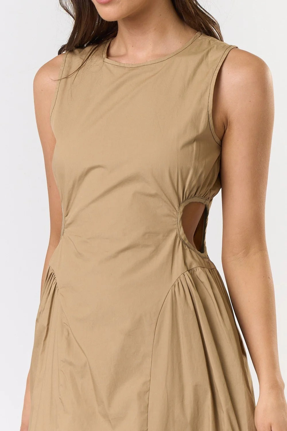 This sleeveless midi dress features side cut-outs with gathered detailing for a subtle play on structure and flow. A clean round neckline and full skirt balance the silhouette for easy styling across settings.
